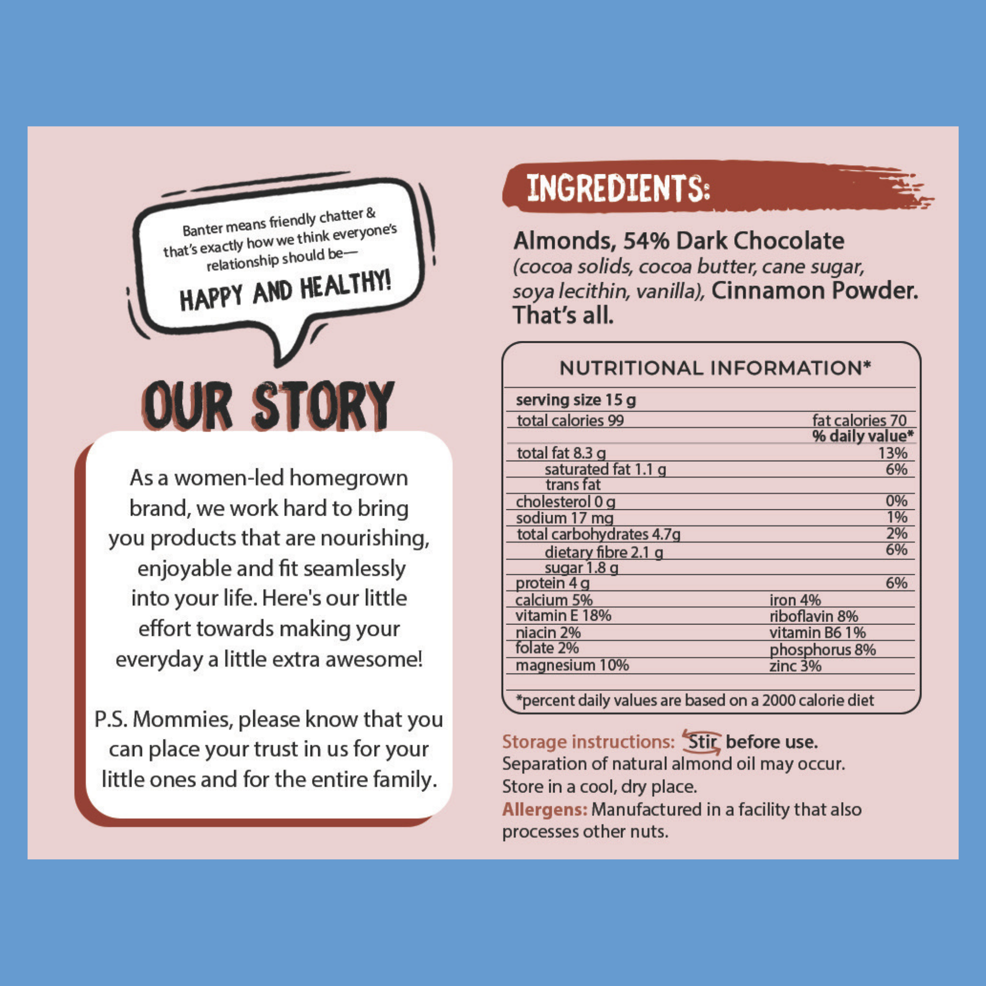 Forget mystery ingredients and tongue twisters on the label. This delicious spread is all about clean, simple goodness. We're talkin' 85% roasted almonds, swirled with decadent dark chocolate and a sprinkle of warming cinnamon. That's it! No added sugar, no artificial anything, just pure, nutty bliss.🤤