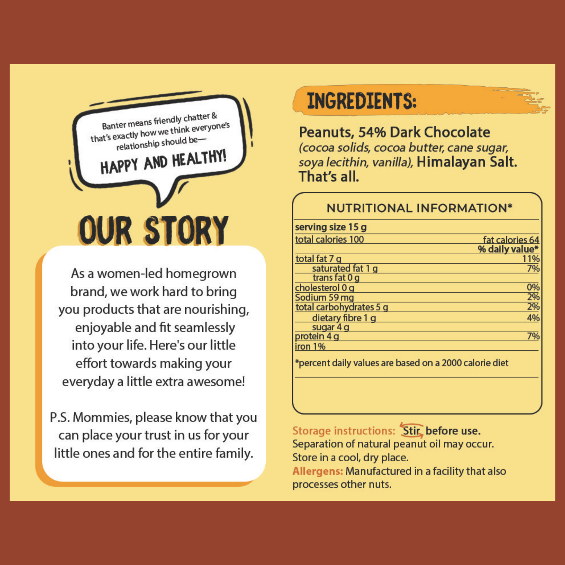 Picture this: 80% peanuts, a generous swirl of rich dark chocolate, and just a hint of Himalayan salt – all mingling together in a jar of pure delight. It's like a chocolatey symphony for your mouth, and we can't wait for you to join the flavour party.