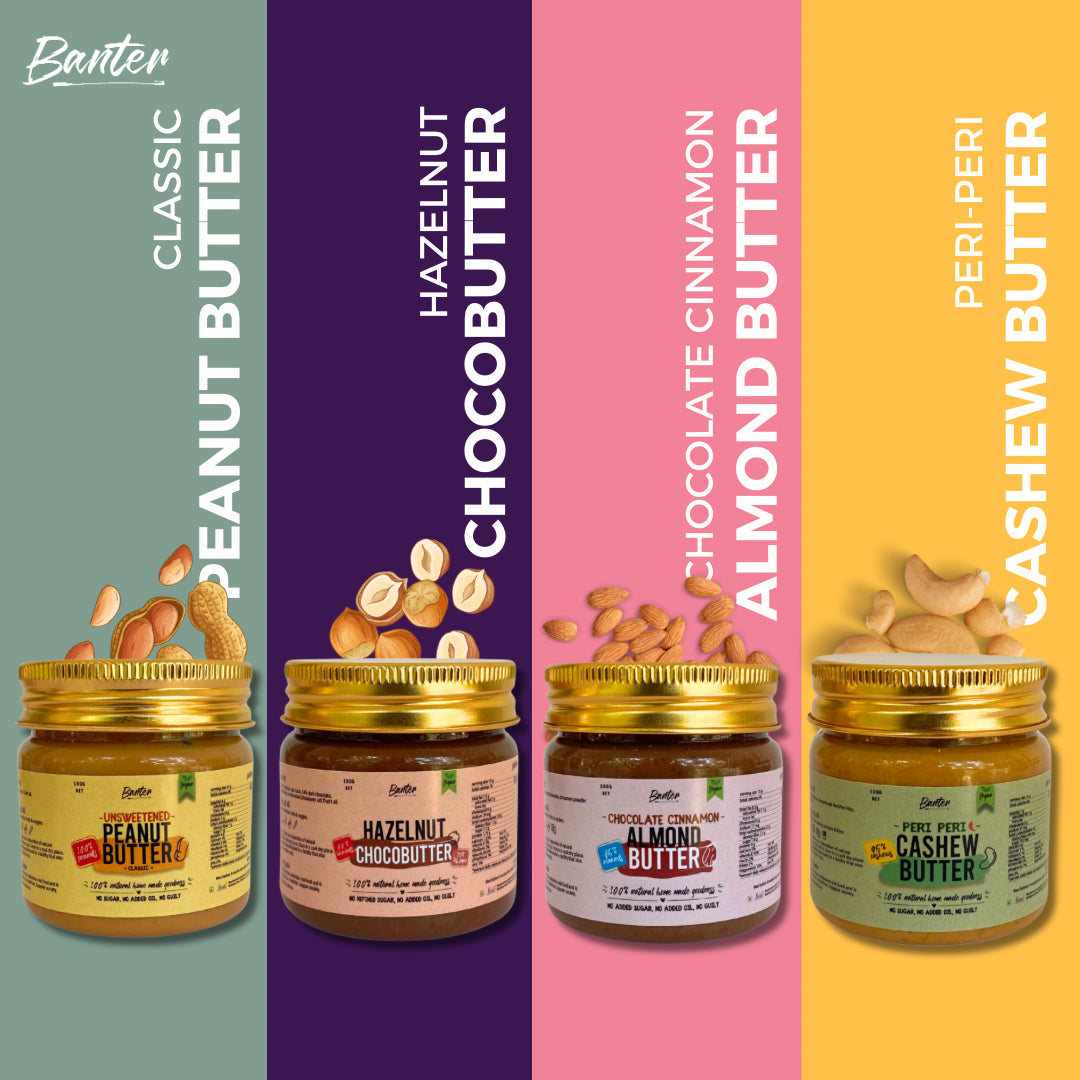 Hazelnut Chocobutter, Chocolate Cinnamon Almond butter, Peri Peri Cashew Butter and Classic Peanut Butter