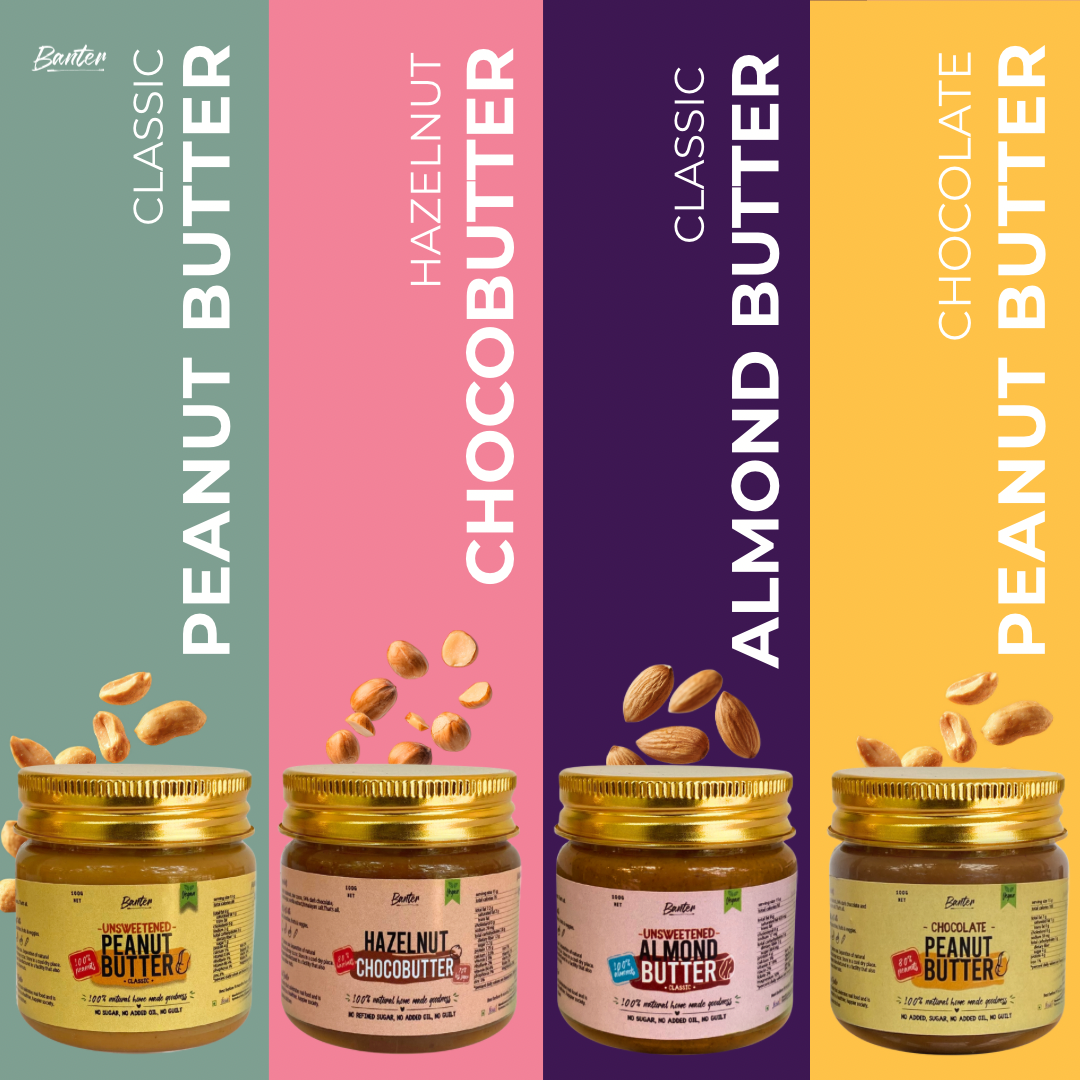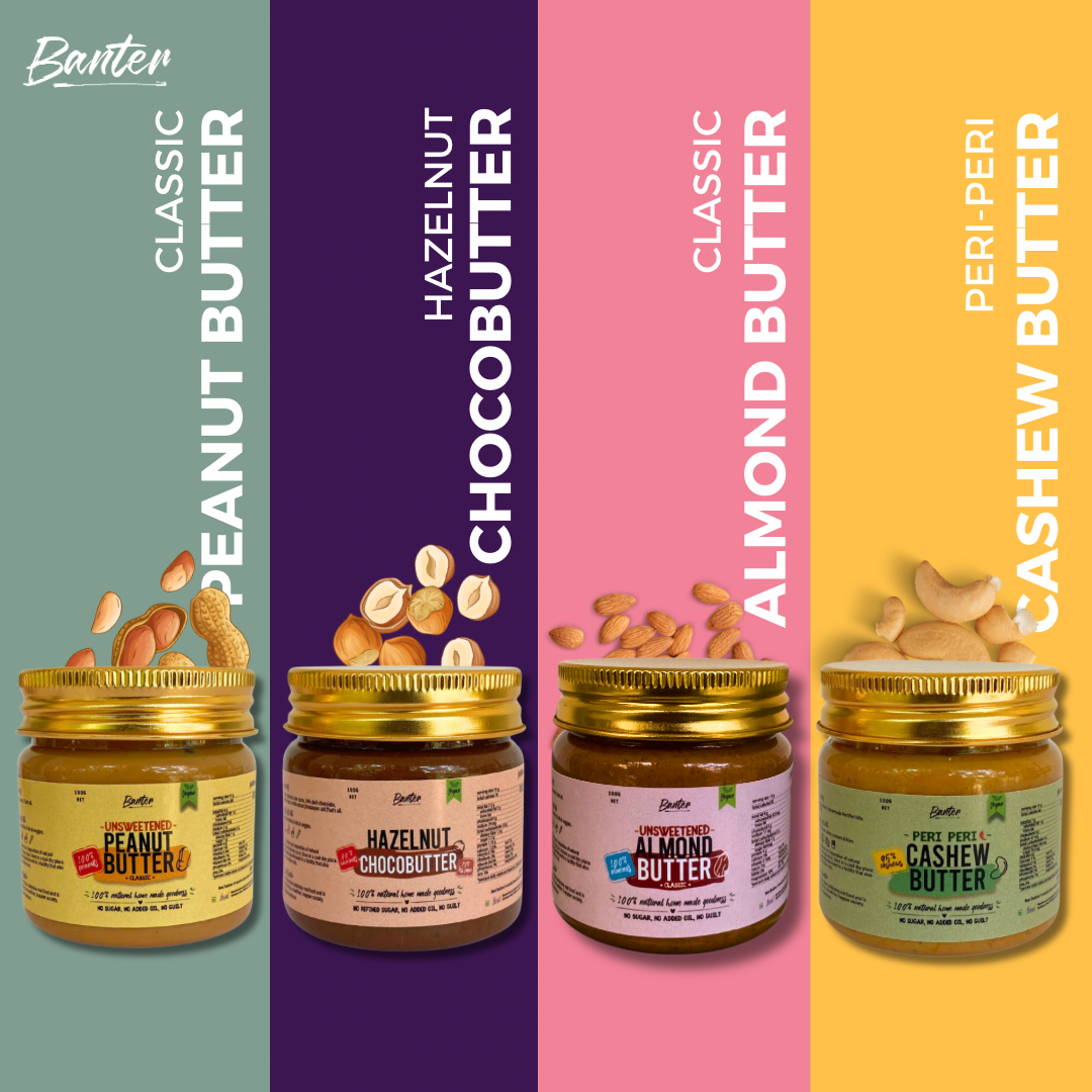 Hazelnut Chocobutter, Classic Almond butter, Peri Peri Cashew Butter and Classic Peanut Butter