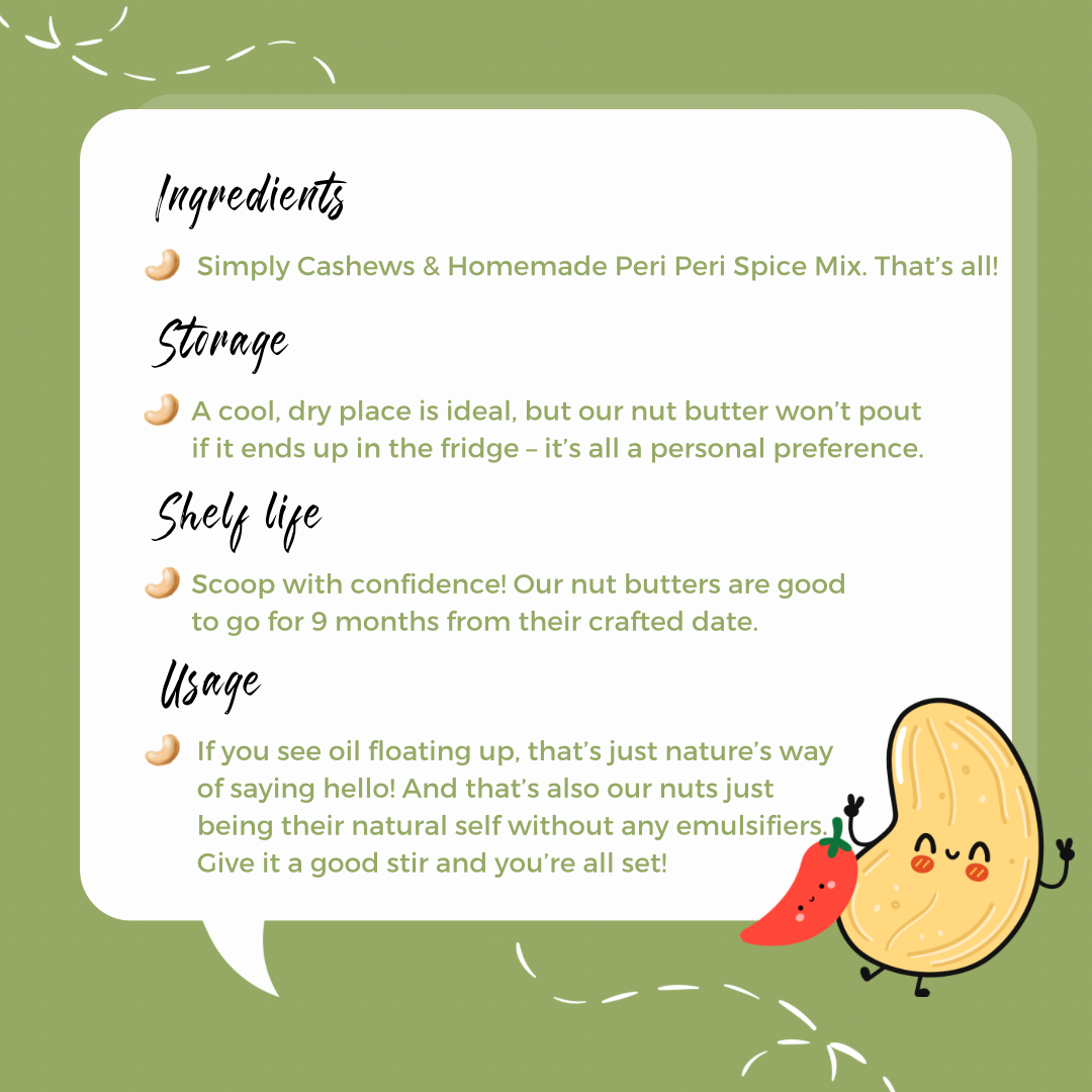 The natural sweetness of cashews blends with zingy peri peri to create a butter that you can’t get enough of. Trust us 🤝, one taste of this lip-smacking nut butter is never enough - and the good news is that it doesn’t have to be!